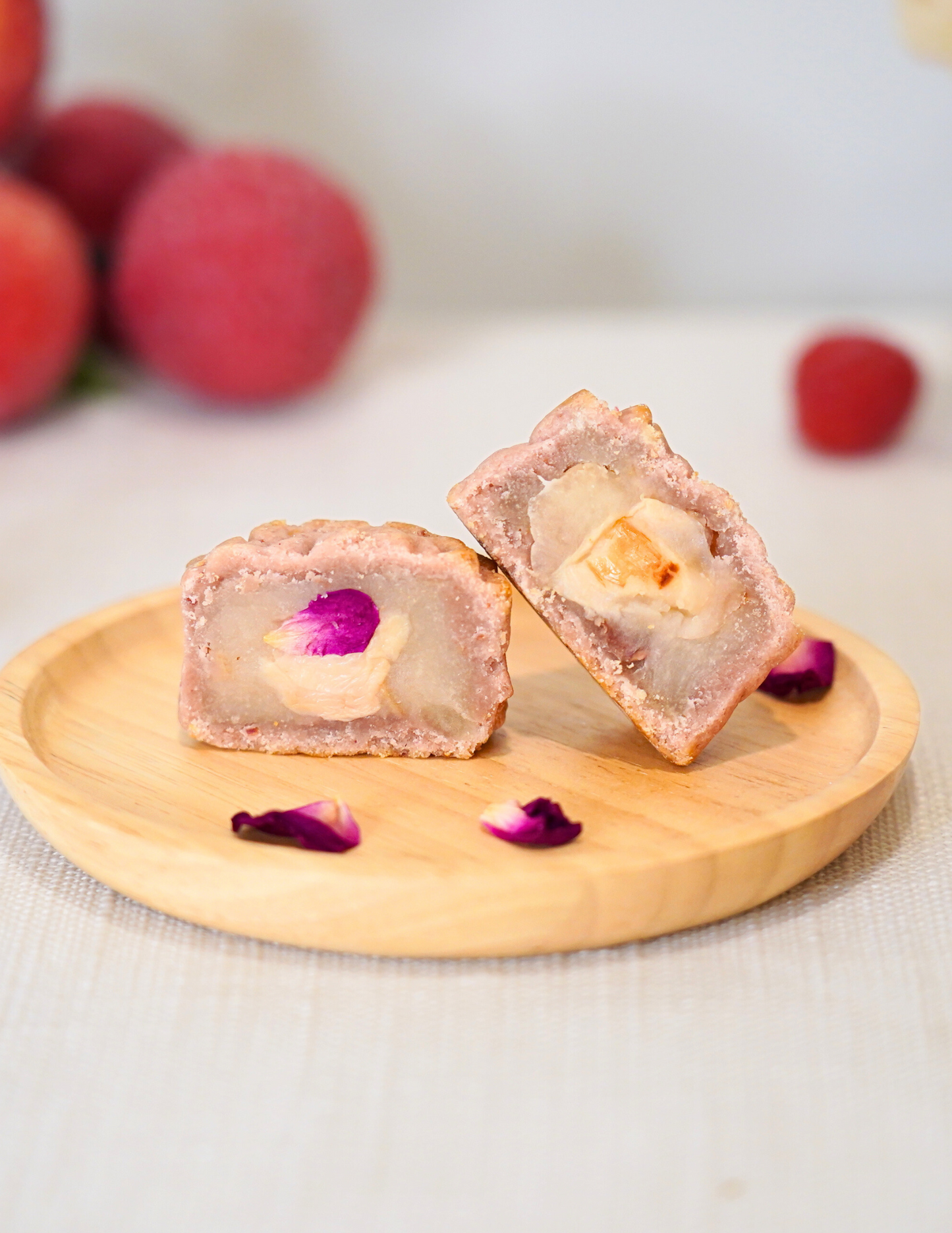 Please note: Our Rose Lychee Mooncake contains wheat, dairy, and eggs. Made in a facility that processes nuts and soy. Reach out with any questions or concerns
